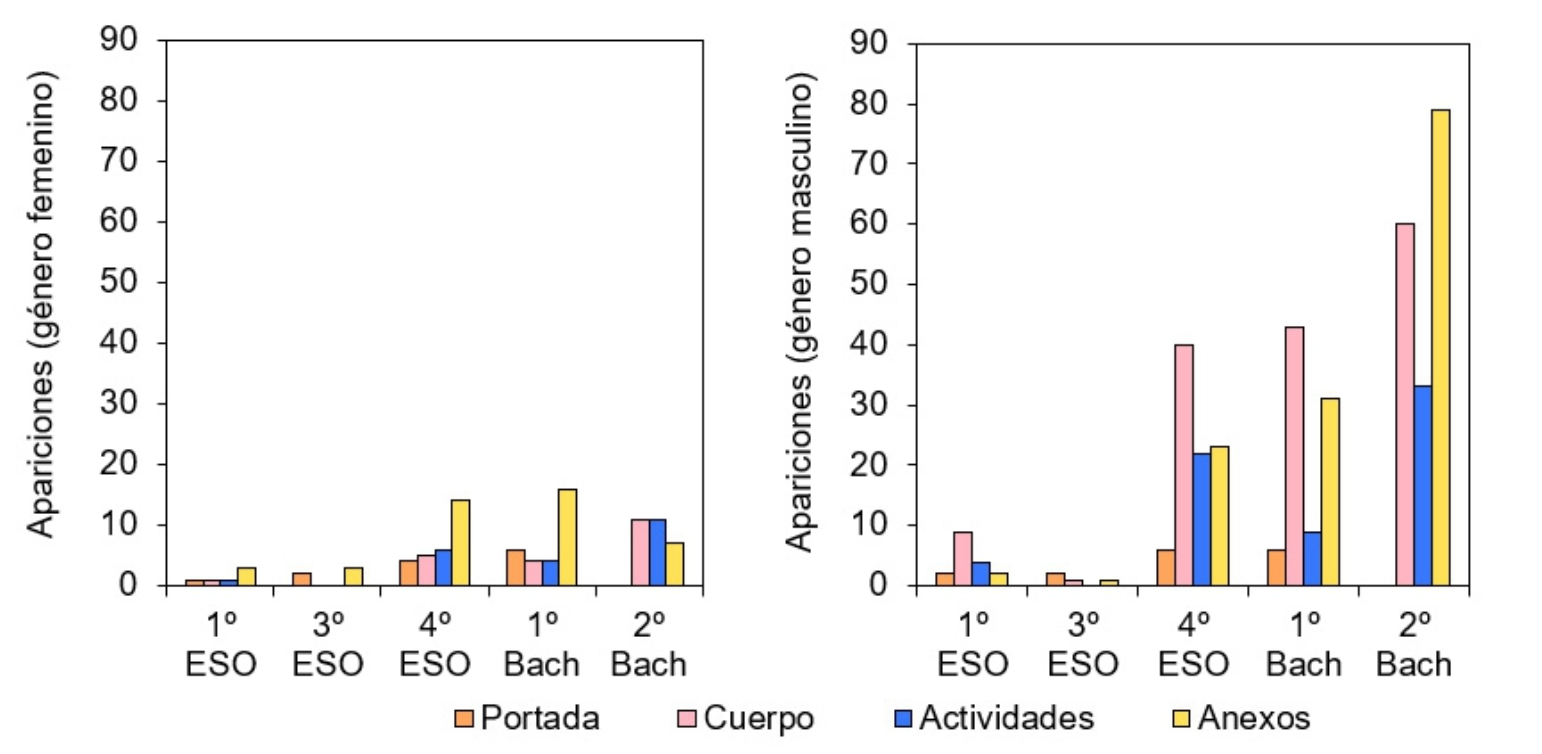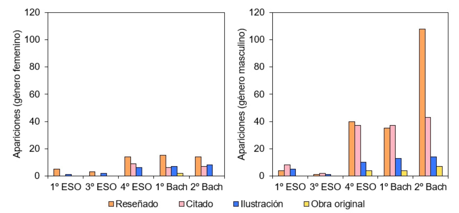 Los resultados del análisis muestran que tanto en el lugar como en el modo de aparición de los personajes en los libros de 4º ESO como de 2º Bachillerato predominan siempre los hombres frente a las mujeres. Al tratarse de dos cursos en los que las personas interesadas en seguir con su formación deben elegir qué estudiar, esta escasa presencia de personajes femeninos podría tener un impacto en cómo evolucionan las vocaciones científicas a lo largo del sistema educativo y conllevar una disminución en la selección de grados o ciclos relacionados con esta rama de la ciencia entre las mujeres.