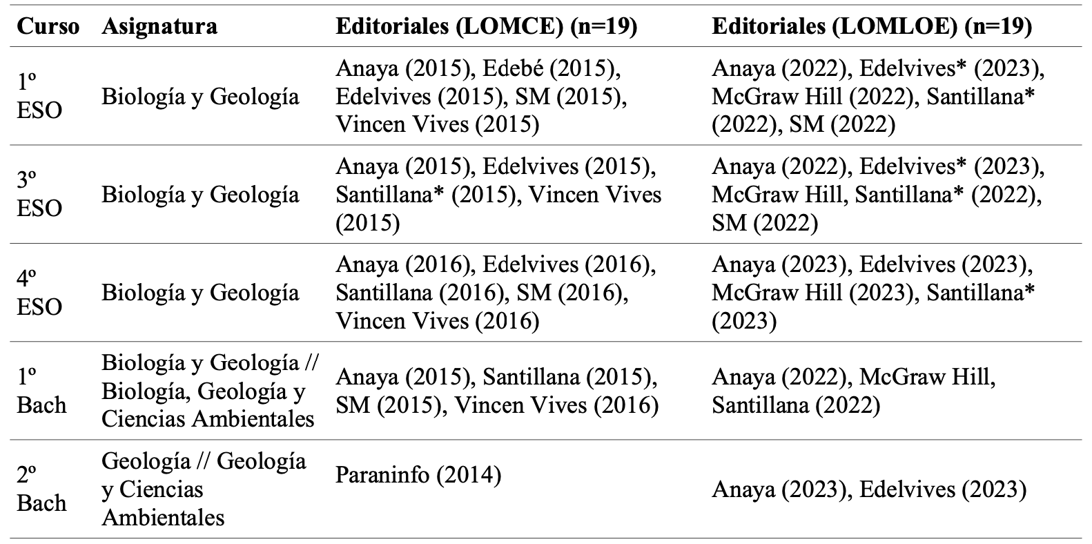 Se ha optado por incluir manuales empleados tanto en ESO como en la etapa inmediatamente posterior, Bachillerato, a pesar de no ser obligatoria. En la ESO los contenidos de biología y geología se imparten en una misma asignatura de manera conjunta, pudiendo llegar a suponer la geología menos de un tercio del total de contenidos (Braceras et al., 2022; Pedrinaci, 2014). En el caso de 1º Bachillerato la situación es similar pero en 2º de Bachillerato sí existe la posibilidad de que el alumnado pueda ampliar sus conocimientos geológicos cursando una materia que se centra exclusivamente en la geología y las ciencias ambientales, permitiendo introducir conceptos más complejos y diversos que en cursos anteriores. Aun así, es necesario tener en cuenta que esta asignatura no es obligatorio cursarla, lo que implica que el número de manuales disponibles es inferior al de otros cursos.