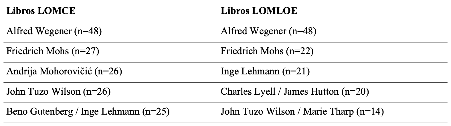 En la Tabla 2 se puede ver qué personajes aparecen con mayor frecuencia. En este caso, el modo de mención sí es un factor relevante dado que, en la mayor parte las veces, cuando se habla de Alfred Wegener es en relación con la teoría de la deriva continental, incluyéndose datos relacionados con su vida y sus hallazgos. En lo que respecta a las apariciones de Friedrich Mohs es, casi siempre, en relación con la escala de dureza de los minerales, pero sin dar más detalles sobre su persona. La única mujer que aparece en ambas listas es Inge Lehmann. El modo más relevante de mención sería como reseñada, sin embargo, no es el más frecuente en este caso (LOMCE n=3 y LOMLOE n=5), predominando estas menciones en los anexos o en la portada de las unidades. Hay, además, un gran número de personas que tan solo aparecen mencionadas una única vez (93 en los libros LOMCE y 86 en los libros LOMLOE, correspondiendo a un 4,3% y 12,4% de mujeres respectivamente).