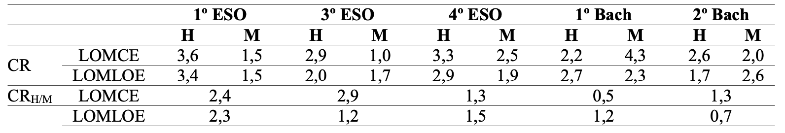 La Tabla 3 muestra el coeficiente de recurrencia (CR) masculino y femenino para los libros publicados en el marco de cada legislación educativa. Solo hay dos casos en los que el CR femenino es superior al masculino, en los libros de 1º Bachillerato LOMCE y en los de 2º de Bachillerato LOMLOE. A la hora de ver desajustes entre la representación de cada grupo de personas, se puede ver que el cociente entre los coeficientes de recurrencia (CRH/M) en esos dos casos es inferior a uno, apareciendo más representadas en proporción las mujeres. Cercanos a la unidad, situación más igualitaria, están los libros de 3º ESO y 1º Bachillerato de la LOMLOE. En cuanto a las variaciones experimentadas tras el cambio en la legislación, se puede ver que en algunos casos la tendencia al predominio de los hombres se ha mantenido muy similar (1º ESO), aunque también ha mejorado en otros (3º ESO).
