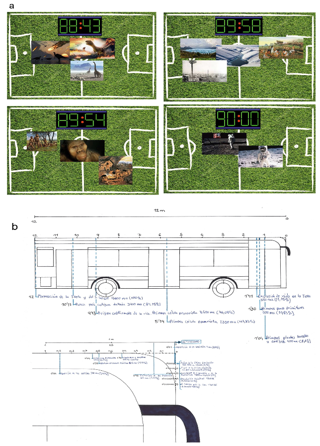 La complejidad de representar los eventos más modernos por la escala utilizada está presente en los dos grupos. En el grupo tiempo, la solventaron más fácilmente aquellos estudiantes que decidieron representar su analogía utilizando viñetas para diferentes momentos de tiempo o emplearon relojes digitales. Como se observa en la Figura 1a, se compara el tiempo geológico con la duración de un partido de fútbol (nótese que sólo se representan en el presente trabajo las últimas cuatro viñetas de la analogía) y el alumno decidió representar los acontecimientos históricos del siglo XX en el minuto 90. El hecho de utilizar la representación de un reloj digital (mediante viñetas) posibilitó representar con detalle todos los eventos.