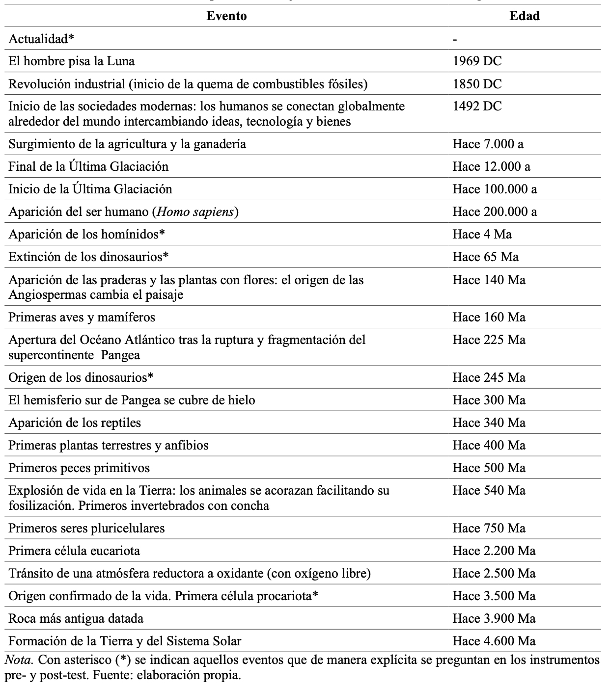 Por último, para profundizar en la utilidad de las analogías como recurso didáctico en su futuro profesional (Shulman, 1986), se pidió a los alumnos que construyeran de forma individual una analogía para explicar el tiempo geológico, siendo ellos mismos los que propusieran el análogo y elaboraran la analogía. Para realizar la tarea, la consigna fue que tenían que cumplir los aspectos generales de diseño de analogías propuestos por Oliva et al. (2001) y emplear los eventos que se recogen en la Tabla 1, 25 hitos que incluyen algunos de los más importantes en la historia geológica, biológica y de la humanidad.