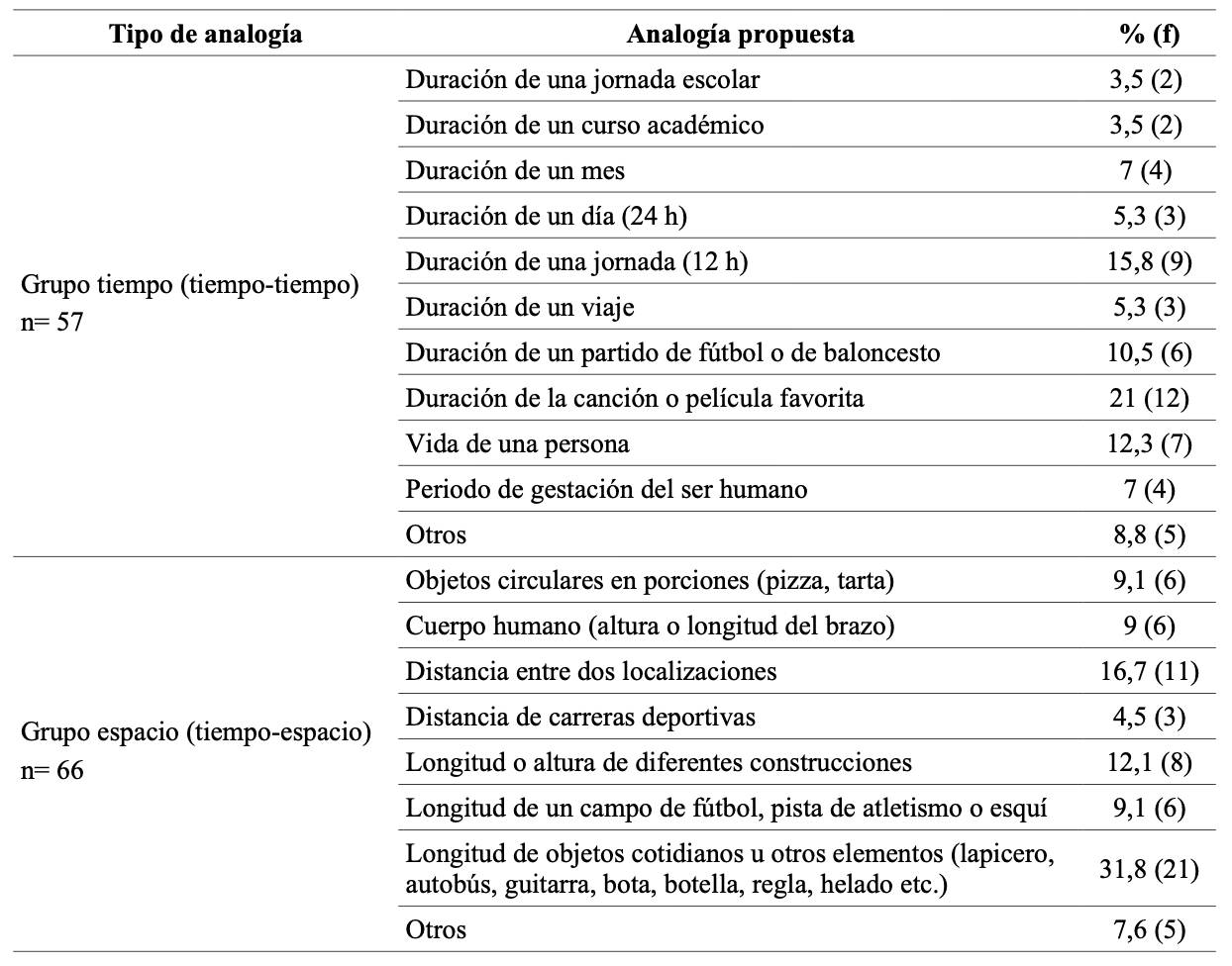 Antes de realizar el análisis estadístico, se revisaron las analogías propuestas por los estudiantes y aquellas que no cumplían con los aspectos generales de diseño o presentaban errores en la configuración de la escala, fueron descartadas para el análisis. De las 131 analogías iniciales, se desestimaron 8 (5 pertenecían al grupo tiempo y 3 al de espacio). Las del grupo tiempo se desecharon porque contenían errores de cálculo en el cambio de unidades, mientras que las del grupo espacio no cumplían con la escala gráfica (presentaban una escala distorsionada para poder representar más fácilmente los eventos más modernos).