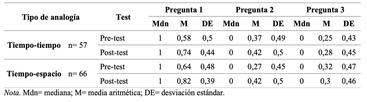 Los resultados de la prueba U de Mann-Whitney mostraron que no había diferencias significativas en el pre-test entre el grupo tiempo y el espacio en ninguna de las tres preguntas analizadas, siendo los valores iniciales en ambos grupos muy similares (Tablas 3 y 4).
