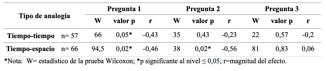 Los resultados del test de Wilcoxon revelaron un avance considerable y diferencias significativas en dos de las tres preguntas entre los resultados pre-test y post-test. En concreto, el grupo tiempo presentaba diferencias significativas en la primera pregunta, con un efecto práctico moderado r= -0,43 (Cohen, 1988). En el caso del grupo espacio, se observaron diferencias significativas en las dos primeras preguntas, con un efecto moderado r= -0,46 y alto r= -0,56, respectivamente. La tercera de las preguntas analizadas no mostró diferencias significativas antes y después de la intervención en ninguno de los dos grupos (Tabla 4).