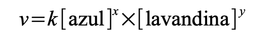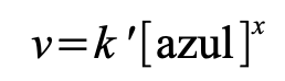 [Ecuación 2]donde v es la velocidad de la reacción de decoloración; k es la constante cinética; [azul] es la concentración del colorante alimentario azul; [lavandina] es la concentración de la solución de hipoclorito de sodio comercial; y x e y son sus órdenes de reacción respectivos. Como se emplea un exceso de solución de hipoclorito de sodio comercial respecto del colorante alimentario, la Ecuación (2) puede reescribirse como se expresa en la Ecuación 3: