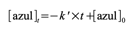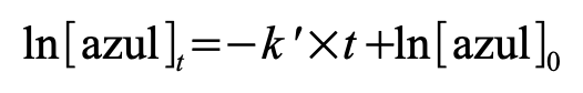 [Ecuación 4]donde [azul]t es la concentración del colorante alimentario azul al tiempo t y [azul]0 es la concentración inicial del colorante en la solución. Por su parte, si la reacción de decoloración es de primer orden respecto de la concentración del colorante alimentario azul, la velocidad dependerá de su concentración y su ecuación integrada se puede representar como se indica en la Ecuación 5: