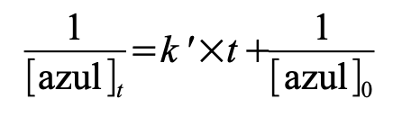 [Ecuación 5]Finalmente, si la reacción de decoloración es de segundo orden respecto de la concentración del colorante alimentario azul, la ecuación integrada se expresa en la Ecuación 6: