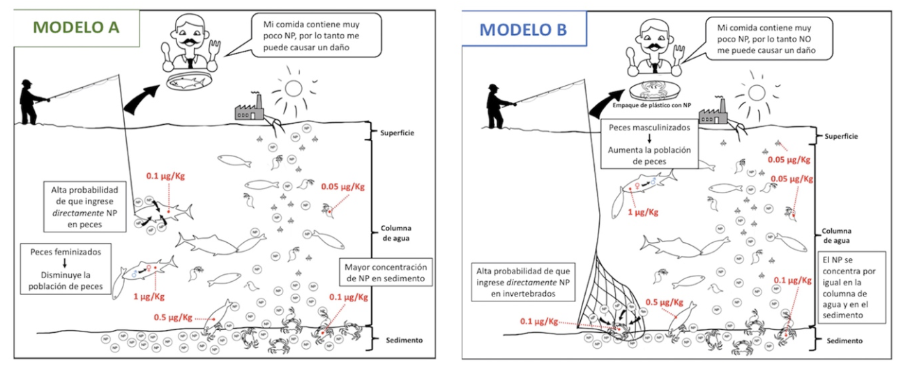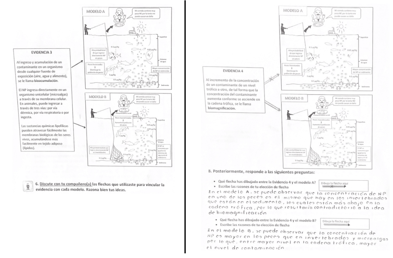 Aunque los modelos son muy similares en cuanto a la información que representan, difieren en aspectos clave: profundidad en donde se concentra mayor cantidad de NP, la concentración de NP en los organismos, la probabilidad de ingreso de NP en diferentes organismos, los efectos hormonales del NP en los peces y el daño potencial al ser humano tras ingerir alimentos contaminados con NP. Esta diferenciación promueve que los estudiantes identifiquen diferencias sutiles en sus supuestos. Además, evita tomar decisiones por intuición superficial, lo que exige un mayor esfuerzo cognitivo (Rinehart et al. 2014).