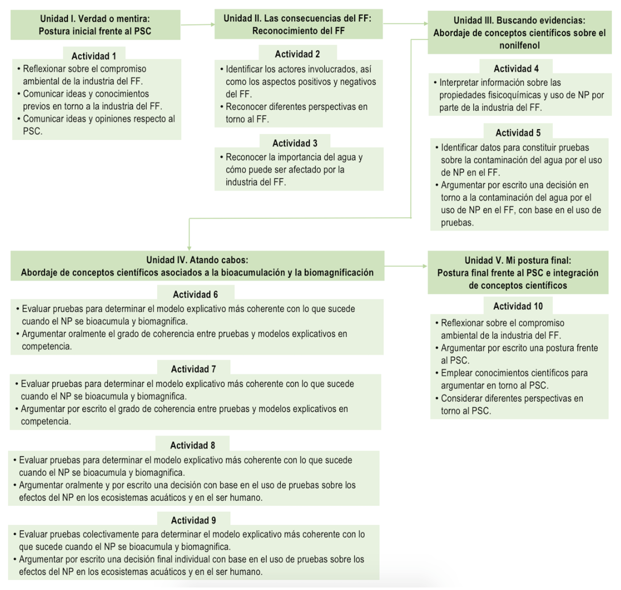Las cinco unidades didácticas que componen la secuencia incluyeron actividades diseñadas para apoyar a los estudiantes en la reflexión y el razonamiento científico, de manera que puedan profundizar en las implicaciones ambientales del FF al argumentar frente al PSC al final de la secuencia (Figura 1).