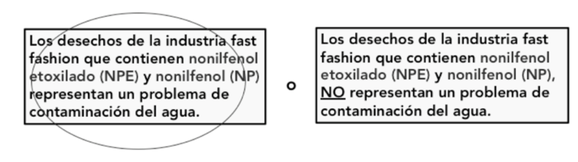 Para apoyar a los estudiantes en la construcción de argumentos científicos, en la actividad 4 se les presentaron, en plenaria y mediante diapositivas, las declaraciones de dos partes involucradas en el PSC: ambientalistas y fabricantes (acceso en: ambientalistas vs. fabricantes). Los argumentos se leyeron y se discutieron en plenaria. Ello permitió que los estudiantes nuevamente consideraran diferentes perspectivas y se cuestionaran en qué medida y cómo se utiliza el NPE y el NP en la industria FF, y si realmente representan una fuente de contaminación del agua. En seguida, se les presentaron dos opciones, de las cuales tuvieron que elegir una, encerrándola en un círculo (Figura 2).