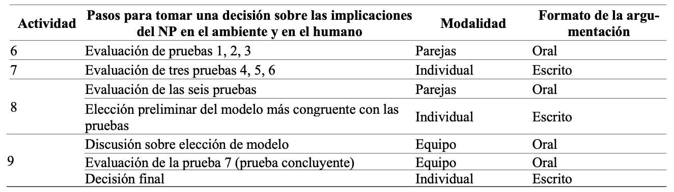 Para dar respuesta a la pregunta sobre el riesgo que representa el NP en los sistemas acuáticos y en el ser humano, las actividades de esta unidad se enmarcaron en el andamio MEL, Model-Evidence-Link (Enlace Modelo-Evidencia), adaptado de Rinehart et al. (2014). Esta herramienta apoyó a los estudiantes en la evaluación crítica de modelos científicos a la luz de diferentes pruebas. El propósito central de esta herramienta fue facilitar la coordinación entre modelos alternativos y las pruebas científicas disponibles, promoviendo la argumentación basada en pruebas.