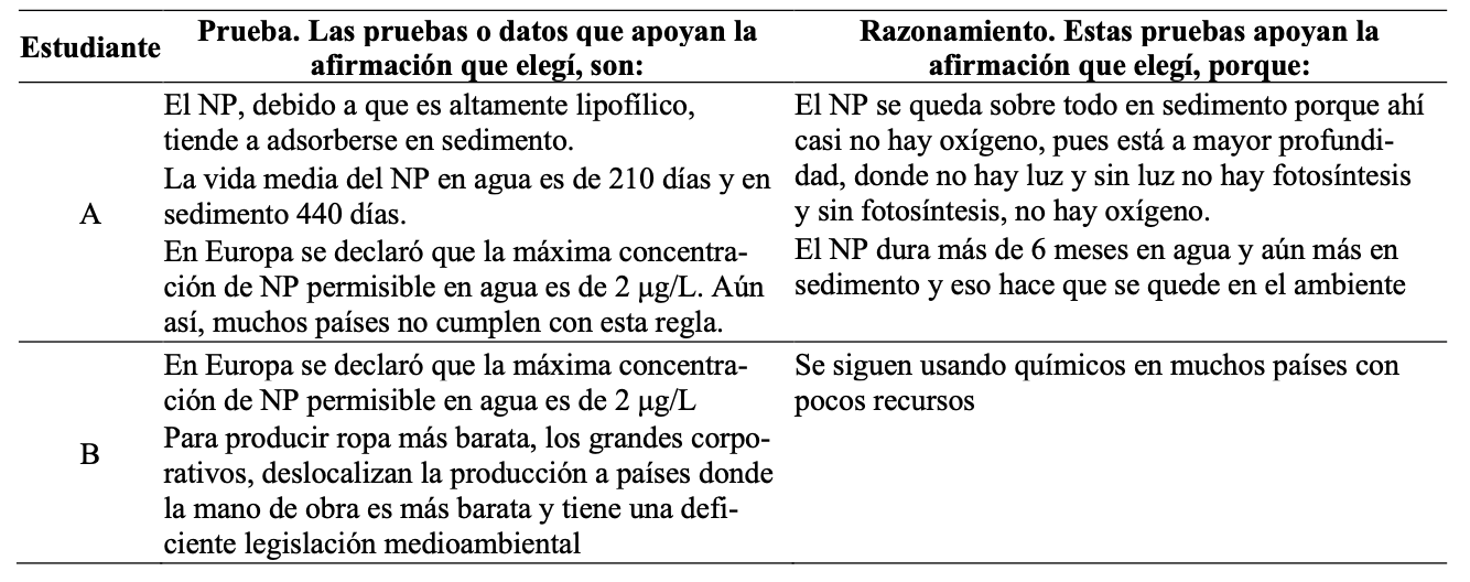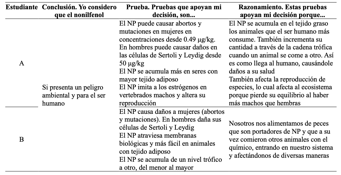 Durante las actividades de la unidad, los estudiantes tuvieron varias oportunidades de evaluar pruebas y discutir sus elecciones para, finalmente, decidir si el NP representa un peligro para el ambiente acuático y el ser humano (Figura 1). Para ello, los estudiantes justificaron individualmente su decisión (conclusión) mediante la identificación de las pruebas que mejor la apoyen a través del andamio CER. Este les ayudó a estructurar su argumento al demandarles explicitar, a través del razonamiento, cómo las pruebas que seleccionaron apoyaron su conclusión (Tabla 6).