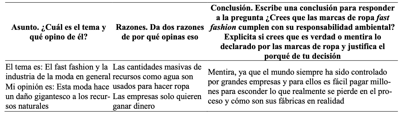 Siguiendo a Zeidler y Khan (2014), al final del relato se introdujo una pregunta polémica que tuvo como propósito cuestionar el conocimiento común de los estudiantes. La pregunta se presentó a través de la declaración: Las marcas de ropa de la industria del fast fashion, afirman cumplir con su responsabilidad ambiental y comercializar productos amigables con el ambiente. ¿Crees que esto es verdad o mentira? Posteriormente, se les solicitó tomar postura individualmente y justificarla por escrito. Esto daría cuenta de sus opiniones frente a la problemática y del tipo de explicaciones que dan sin haber visto aún información científica. Esta respuesta permitiría identificar cómo justifican su postura inicial.