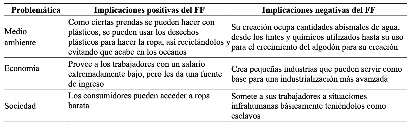 En general, un amplio porcentaje del estudiantado (85%) demostró una comprensión amplia del modelo FF, considerando no solo implicaciones ambientales, sino también aspectos como las injusticias laborales, los intereses económicos de las marcas y el rol del consumidor en el modelo FF. Cuatro estudiantes (15%) se limitaron a mencionar aspectos sociales, económicos y éticos, sin considerar los ambientales.