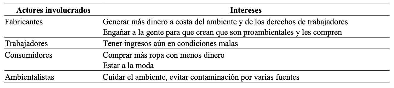 A continuación, completaron una tabla en donde tenían que identificar a los actores involucrados, así como sus intereses (Tabla 3). Así, la intención fue que los estudiantes comenzaran a reconocer los intereses de cada actor y a advertir que tomar una postura o plantear soluciones requiere sopesar diferentes perspectivas.
