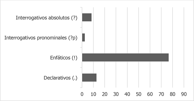 Los porcentajes de errores, muy reducidos salvo en los enunciados enfáticos, resultan menores en el nivel intermedio que en el básico para los aludidos enunciados enfáticos (!) y para los interrogativos de valor absoluto (?), distanciados por 7,72 y, tan solo, 1,37 puntos respectivamente. Por el contrario, las cifras del intermedio se observan mayores que las del básico en el caso de los declarativos (.) e interrogativos pronominales (?p), si bien la separación es únicamente del 1,42% entre los primeros y del 0,03% entre los segundos (V. tabla 3).
