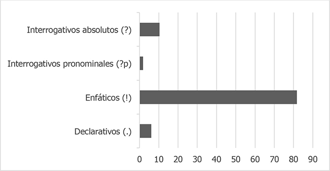 En un nivel más general de análisis, consideramos únicamente tres grandes categorías: confusiones entre enunciados declarativos (.) y enfáticos (!), entre declarativos (.) e interrogativos directos (?), y entre enfáticos (!) e interrogativos directos (?) (V. tabla 7).