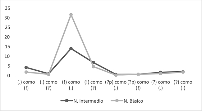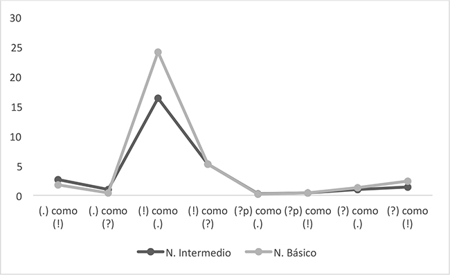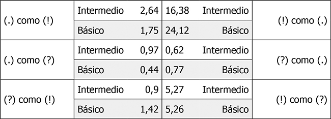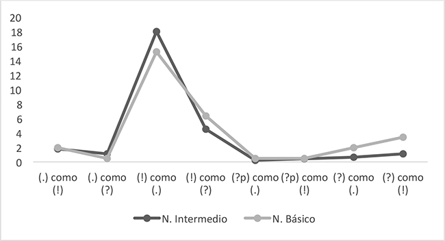 En este sentido, apreciamos que el error de interpretar [(!) como (.)] fue más frecuente que el de interpretar [(.) como (!)] en el nivel intermedio y también en el básico, un 13,74% más frecuente en el intermedio y un 22,37% más en el básico, así como que, en consecuencia, la diferencia de frecuencia entre ambos tipos de equívocos se revela un 8,63% mayor en el elemental que en el intermedio. Existe igualmente mayor proporción del fallo [(!) como (?)] que de su contrario en ambos niveles; las diferencias de incidencia entre estos tipos de yerros enfrentados son del 4,37 y del 3,84% respectivamente para el intermedio y el inicial, de manera que el error [(!) como (?)] se perfila un 0,53% más abundante que su opuesto en el intermedio que en el básico. Acudiendo a la tercera oposición, en cambio, los datos revelan que el error [(.) como (?)] sobresale por recurrencia a su antagonista en el nivel intermedio pero no así en el básico, donde sucede al contrario, aunque las diferencias de frecuencia entre polos resultan del 0,35% en aquel nivel y del 0,33% en este, lo que revierte en una diferencia de diferencias entre niveles del 0,02%.