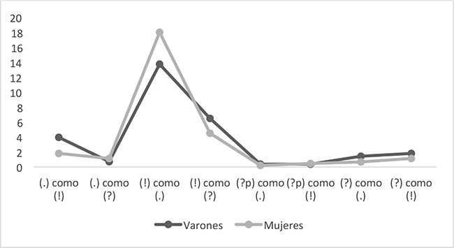 A tenor de los perfiles de la figura 6, podemos afirmar que la distribución de frecuencias de los diferentes tipos de errores se asemeja mucho en ambos sexos en el nivel intermedio. Los varones obtuvieron porcentajes superiores a los de las mujeres en cinco tipos de errores, aunque sus diferencias oscilan entre el 4,25% de [(!) como (.)] y el 0,09% de [(?p) como (!)]. Por otro lado, las escalas descendentes de frecuencias de tipos de errores despliegan la misma disposición para los dos sexos en seis de sus siete puestos: 1.º [(!) como (.)], 2.º [(!) como (?)], 3.º [(.) como (!)], 4.º [(?) como (!)], 5.º [(?) como (.)] y 7.º [(?p) como (.)], aunque en el cuarto puesto de las mujeres hallamos también el error de [(.) como (?)], y en el séptimo de los varones, el de [(?p) como (!)]. El sexto lugar, por su parte, alberga una última diferencia: el error [(.) como (?)] de ellos frente al [(?p) como (!)] de ellas.