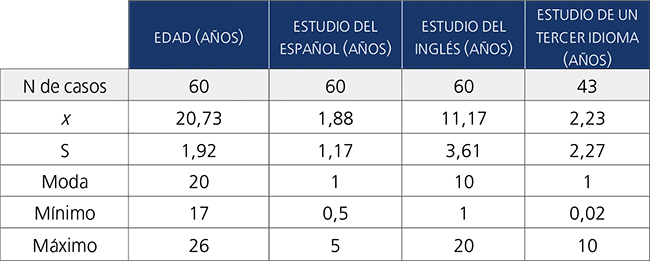 Participaron también en el estudio los 65 alumnos de la Hankuk University of Foreign Studies (HUFS) (campus de Seúl) matriculados en tres grupos de la asignatura de Conversación en español de nivel intermedio. No obstante, fueron posteriormente 60 (37 mujeres [62 %] y 23 varones [38 %]) los que formaron la muestra estadística de oyentes, debido a que cinco de los estudiantes matriculados respondieron de forma errónea al cuestionario sobre datos personales que sirvió a la confección de la tabla 1. En dicha tabla puede hallarse información sobre la edad y experiencia de los oyentes en el estudio de lenguas extranjeras a través del número de casos (N), la media aritmética (x), la desviación estándar o promedio de variación con respecto a la media (S), la moda, el mínimo y el máximo.