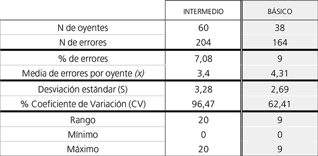 Tales cifras muestran tasas que interpretamos como muy bajas en los dos niveles considerados, particularmente en el intermedio, en el que se erró un 1,92% menos que en el básico. Algo parecido percibimos, como no podía ser de otra forma, con respecto a la media de errores por oyente (x), donde la del nivel intermedio aparece reducida en un 0,91% con respecto a la del elemental.