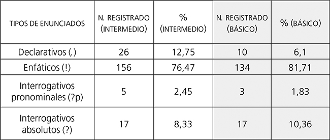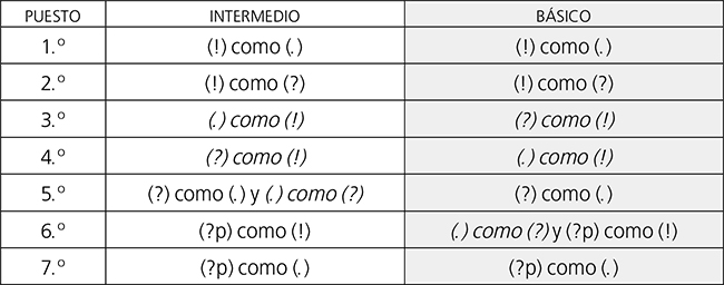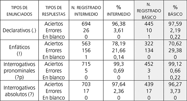 Si atendemos al número de respuestas en blanco, el nivel intermedio solo muestra una –en los enunciados enfáticos (!) –a la vez que en el básico encontramos dos –una en los declarativos (.) y otra en los interrogativos pronominales (?p)– (V. tabla 3).