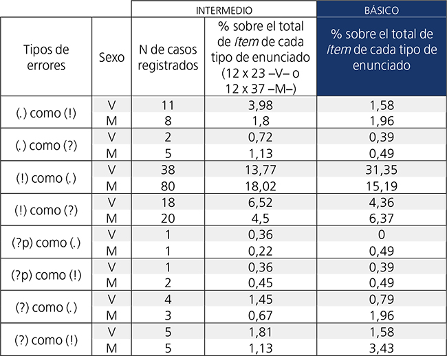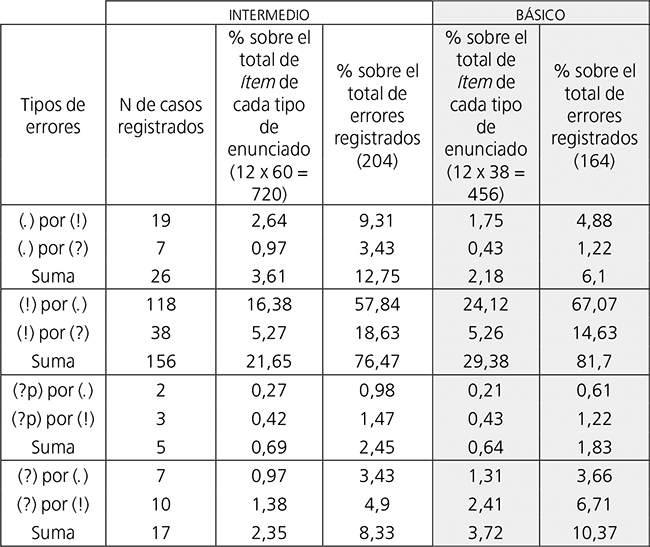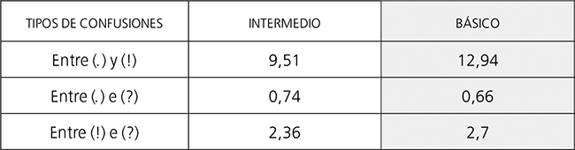 Asimismo, debemos destacar la escasísima diferencia de porcentaje en siete de los ocho tipos de error de uno a otro nivel –con huecos del 0,01% en [(!) como (?)] e [(?p) como (!)] al 1,03% en [(?) como (!)]–, al tiempo que la mayor distancia entre porcentajes de tipos de fallos radica en un 7,74% del tipo [(!) como (.)]. Paralelamente, el nivel básico superó por frecuencia al intermedio en la mitad de los tipos de errores, entre ellos en el de [(!) como (.)] por los mencionados 7,74 puntos porcentuales; el intermedio al básico, en la otra mitad (aunque por las exiguas cuantías ya aludidas).