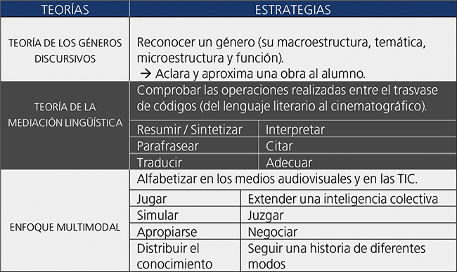 Abstract: Many teachers of Spanish for foreigners who use film and television recreations in our classrooms, commonly known as adaptations. The purpose of this article is to offer a theoretical framework that serves as a basis for the development of activities and didactic units. To do this, we will focus on theories of discursive genres, the approach of linguistic mediation and that of multimodal literacy as models that suggest the guidelines that we will follow when using narrative texts in the classroom that have a Film or television adaptation.