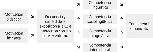 Como ya se señaló con anterioridad, la formación de estas competencias, a su vez, está influida por la frecuencia y calidad de exposición a la lengua, además de la interacción con sus pares y entorno. Ello se logra gracias a su motivación intrínseca (desarrollada mediante la disposición del estudiante de relacionarse con su entorno) y, teniendo en cuenta el contexto formal de enseñanza, a una metodología didáctica que oriente y facilite tal situación. Todo esto conducirá a una frecuencia y calidad de exposición a la lengua, así como de las interacciones que se busquen establecer con nativos hispanohablantes. De tal modo, consideramos que la calidad se logra a partir de una selección adecuada de muestras auténticas de habla y el planteamiento de experiencias interactivas significativas para lo cual no bastaría la mera predisposición del aprendiente, sino una metodología didáctica planificada y, a su vez, adecuada a sus necesidades que estructure las unidades de aprendizaje desde un enfoque comunicativo e intercultural (véase figura 1).