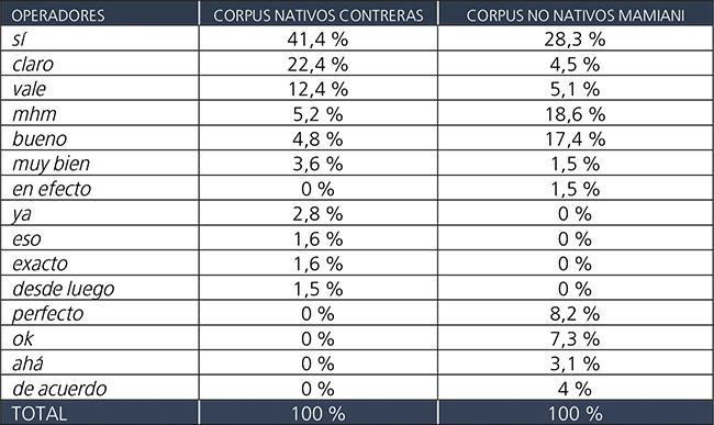 Constituye una segunda tendencia de los aprendices la utilización de operadores desconocidos en el discurso de hablantes nativos como va bien y está bueno. Por último, pero no menos importante, los hablantes nativos hispanófonos utilizan en los diálogos examinados esencialmente tres marcadores de afirmación con una frecuencia de uso mayor respecto a la frecuencia de uso en los aprendices: sí, claro y vale. Así, es posible observar que en el corpus de nativos el uso del operador claro presenta un porcentaje de 22,4 % con valores que se aproximan a los de sí (41,4 %); por su parte, los aprendices usan claro solo un 4,5 % de las ocasiones en las que recurren a un operador discursivo. Por otra parte, resulta interesante señalar que los nativos usan mhm un 5,2 % mientras que los estudiantes lo usan un 18,6 %. Tal desproporción permitiría formular la hipótesis de que los alumnos utilizan ese operador porque permite reflejar, como veremos más adelante, una falta de competencia comunicativa en recepción (mayor necesidad de tiempo para entender y adquirir la información que se les propone) y en producción (mayor titubeo a la hora de elegir la expresión adecuada).