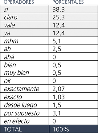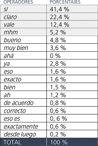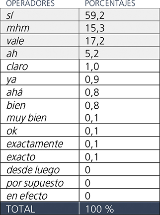 Para corroborar la anterior observación, examinemos los datos de nuestros corpus. En primer lugar, en textos cuya finalidad comunicativa primordial consiste en el intercambio de información, como ocurre en los diálogos Task-Oriented, los operadores de “afirmación” más frecuentes son: sí con un 59,2%, mhm con un 17,2% y vale con un 15,3%. El porcentaje de uso de los demás operadores baja significativamente a un 5,2% con Ah y por debajo del 1% en el resto de los operadores.