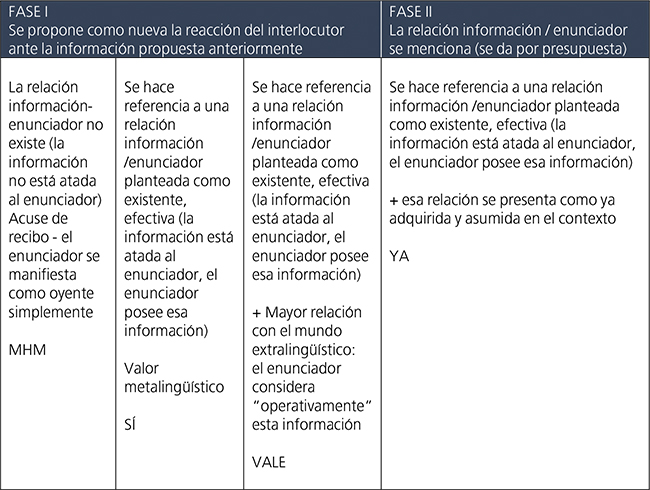 Por lo que concierne a las distintas operaciones metalingüísticas que han sido objeto de nuestro estudio, hemos examinado las más frecuentes en nuestros textos: a) cuando el enunciador acusa simplemente recibo de la información (mhm), b) cuando explicita que asume la información en su discurso (sí), c) cuando además de asumirla actúa con ella (vale) y d) cuando la presupone como ya adquirida (ya).