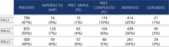 En conclusión, podemos decir que realizar una clasificación de las formas verbales tal y como habíamos hecho con anterioridad en Musto (2009) no podía funcionar. Entre otras cosas, hay que tener en cuenta que tanto los aprendices nativos como los del grupo de control italiano son todos de la región Campania, mientras que el grupo de control de nativo español son todos de Valencia. Este hecho tiene repercusiones notables en cuanto al uso de los tiempos verbales. Como se sabe, en el sur de Italia hay una mayor frecuencia de uso del pasado simple respecto del norte. Mientras que en la zona catalanohablante hay un mayor uso de las formas analíticas, que contrasta con otras áreas más centrales de España.