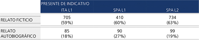 En este caso, como en el estudio anterior, podemos afirmar que el empleo del presente de indicativo es mayor con respecto a otras formas verbales, tanto en los dos grupos de contraste como en el grupo de aprendices. Sin embargo, por lo que se refiere a su uso en los dos tipos de producciones, relato ficticio y relato autobiográfico, observamos que los porcentajes en los tres grupos son netamente inferiores en la narración autobiográfica. Véase la siguiente tabla: