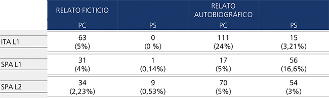 Si centramos nuestra atención en las formas del pasado del corpus, constatamos que el pasado compuesto (PC) es utilizado en mayor medida por el grupo de contraste italiano en comparación con el español. No obstante, los datos del español no confirman, como se esperaba, un uso dominante del pasado simple (PS). O al menos no se confirman plenamente. De hecho, en el texto de ficción los encuestados usan mayormente los PC, mientras que aumenta el uso de PS en el relato autobiográfico, tal y como se muestra a continuación: