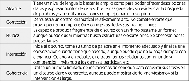 Más específicamente, dentro del MCER elegimos los aspectos cualitativos del uso la lengua hablada en detrimento de la plantilla de autoevaluación propuesta por ser estos más descriptivos del nivel y la destreza requeridos.