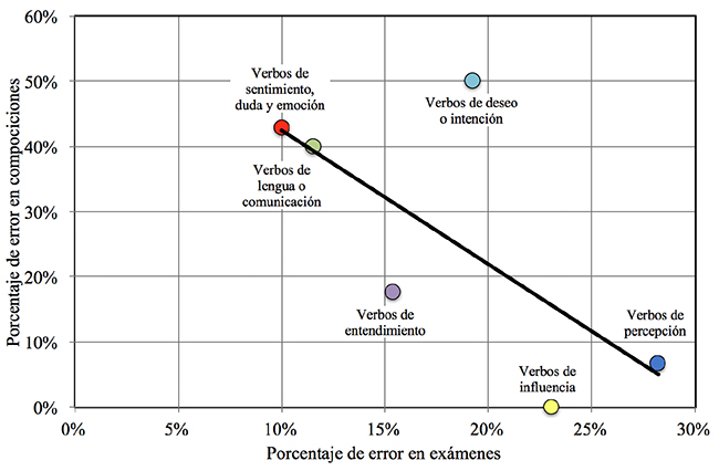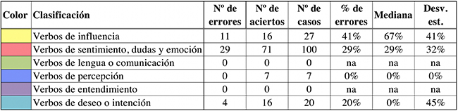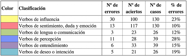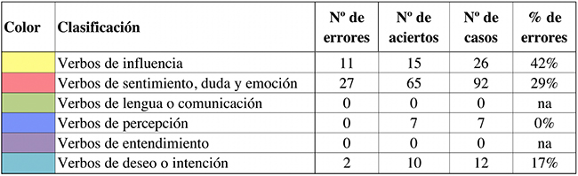En el análisis de las composiciones, los verbos con mayor producción en los escritos fueron los verbos de entendimiento y percepción siendo ambos verbos los que menor tasa de error registraron, 18% y 7% respectivamente. No obstante, el uso de los verbos de lengua, deseo y sentimiento fue bajo, alcanzándose una tasa de error del 55%, 50% y 43% respectivamente. Existe una excepción que se debe al verbo de influencia recomendar (0%). Este verbo se pide en el enunciado de la redacción especificándose al alumno que se trata de un verbo de influencia por lo que su reconocimiento inmediato hace que se produzca en los escritos sin dificultades.