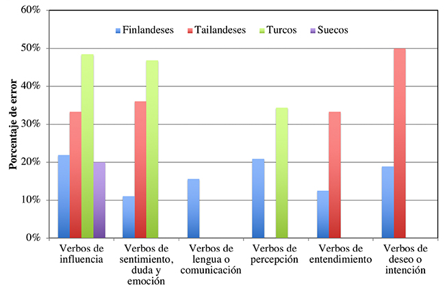 En los verbos de influencia coinciden las cuatro lenguas de estudio. En el caso de los aprendientes finlandeses, estos verbos fueron los que mayor dificultad supusieron en su adquisición, con un 22% de error. Este dato es muy similar al del estudio del grupo de sueco, -20%- de error, pero no así para los turcos -48%- o los tailandeses -33%-. En el análisis de verbos de sentimiento, el grupo de los finlandeses ha demostrado mayor facilidad en su adquisición, con el 11% de error, frente a un 47% con los turcos y un 36% con los tailandeses.