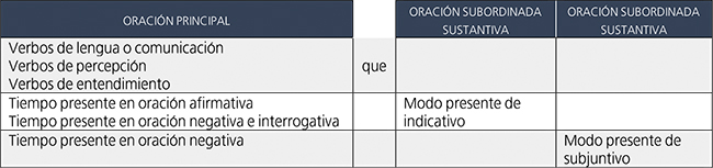 El subjuntivo puede figurar en distintos tipos de oraciones, en nuestro caso en concreto, las oraciones subordinadas sustantivas, llamadas así porque funcionan como sustantivos en la oración principal. En aras de claridad, mostramos las tablas 1 y 2 el uso del modo indicativo / subjuntivo en la oración subordinada sustantiva dependiendo del tipo de predicados de la oración principal.