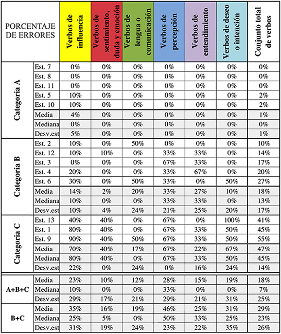 - Producciones con presente de indicativo y subjuntivo: con verbos de influencia el error alcanza un 22%; con verbos de percepción el 21%; con verbos de deseo el 19%; con verbos de lengua el 16%; con verbos de entendimiento el 13%; y con verbos de sentimiento el 11%.