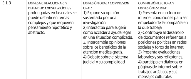 objetivo: los estudiantes continúan desarrollando sus competencias comunicativas interactuando de forma oral y escrita con otros hablantes de español, remarcando mensajes orales y escritos en español, y haciendo presentaciones orales y escritas. Ellos se comunican en varios temas en un nivel acorde y mesurado con sus estudios, usando estructuras complejos en español y desplazándose desde lo concreto hasta conceptos más abstractos. Ellos pueden comprender las ideas principales de los materiales auténticos que escuchan y leen y son capaces de identificar detalles significativos cuando los temas son conocidos. Los estudiantes desarrollan la habilidad de discutir en español temas y eventos relacionados con sucesos históricos y contemporáneos.