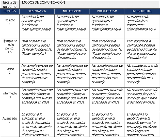 En cuanto a las unidades del nuevo currículo de ELE, se elaboraron de la siguiente manera: (i) Se establecieron los criterios para delimitar y determinar qué correspondía a una competencia básica, intermedia y avanzada en ELE. (ii) Se alinearon las formas de evaluación con las metas de los estándares, para de esa forma saber cómo y de qué forma se iba a medir el nivel de adquisición del idioma. (iii) Se organizaron exámenes y pruebas semanales, mensuales, semestrales y anuales que se ajustaran a dichos estándares. De esa forma se garantizaba evaluar al estudiante en los estándares y destrezas a las que serían expuestos. (iv) Se prosiguió a desarrollar una escala[1] de calificación basada en cuatro puntos (Ver Anexo A3) que a su vez podría contar con subescalas de medio punto cada una diseñada por el docente encargado de impartir la asignatura de ELE y que se ajustaba al tipo de prueba a la que el estudiante iba a ser expuesto. (v) Al final del curso, se revisaron nuevamente las unidades didácticas diseñadas y se efectuaron cambios en aquellos elementos en los que se evidenció algún fallo. (vi) A lo largo de todo el proceso de pilotaje, se mantuvieron reuniones semanales con los encargados de impartir el nuevo currículo de ELE con el objetivo de analizar las prácticas y las experiencias vividas dentro del salón de clase.