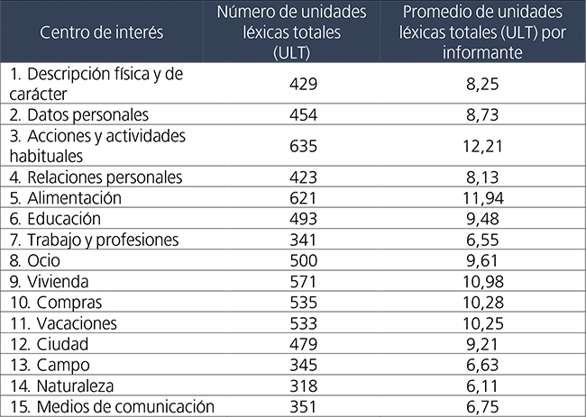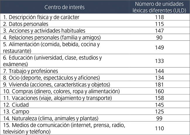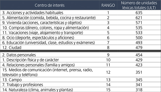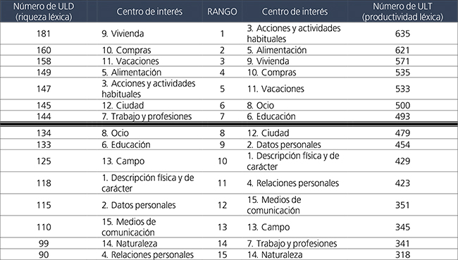 En términos de riqueza léxica, los centros de interés más ricos, es decir, los que presentan más unidades léxicas diferentes, son 9. Vivienda (acciones, características y objetos), 10. Compras (dinero, colores, ropa y alimentación) y 11. Vacaciones (viaje, alojamiento y transporte). Estos tres centros de interés pertenecen a la realidad cercana de los estudiantes y, además, son abiertos, pues contienen varios subtemas que facilitan la evocación de diferentes unidades léxicas. Al contrario, los centros 4. Relaciones personales (familia y amigos) y 15. Medios de comunicación (internet, prensa, radio, televisión y teléfono) son de carácter cerrado, no admiten una variedad léxica tan alta como los anteriormente citados. En cuanto a 14. Naturaleza (clima, animales y plantas), a pesar de ser un tema muy rico léxicamente, se trata de una realidad no tan cercana a los estudiantes y, además, no se trabaja específicamente (a excepción del clima) en el manual que emplean los alumnos.