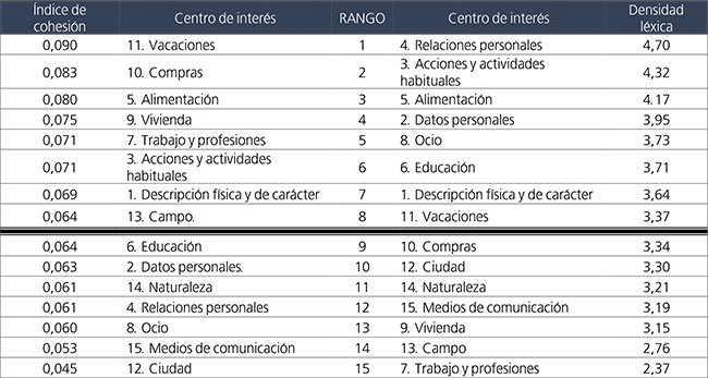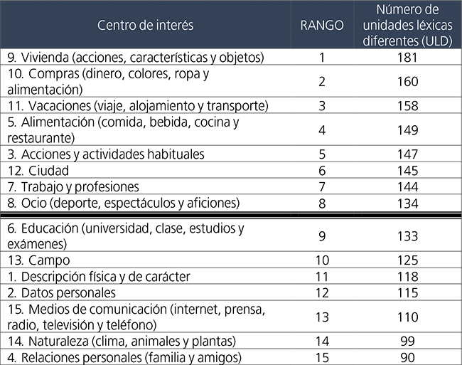 Además, distinguimos que los centros de interés más ricos son 9. Vivienda, 10. Compras y 11. Vacaciones, mientras que los menos ricos son 4. Relaciones personales, 14. Naturaleza y 15. Medios de comunicación. Conocer el motivo de estos resultados resulta complejo. Podemos entender que estos son aquellos centros cuya temática no solo es cercana a los estudiantes, sino que presentan una variedad grande de unidades léxicas que los contienen. En cambio, 14. Naturaleza se trata de un centro más alejado de nuestros alumnos y, por lo tanto, ocupa un rango muy bajo. En cuanto a 4. Relaciones personales y 15. Medios de comunicación, creemos que el principal motivo de esta baja riqueza léxica es más bien propia de estos centros de interés, ya que encontramos un número menor de ULD que pueden asociarse a ellos. De todas formas, tal y como decíamos en el apartado relacionado con la productividad léxica, las características del libro de texto que utilizan también puede ser un motivo fundamental que afecta a estas diferencias en el rango, con lo que dejamos anotamos este motivo para indagar en él en trabajos posteriores.