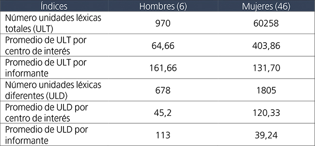 En la tabla, puede verse a simple vista que existe una diferencia enorme entre los resultados extraídos del grupo de hombres y el grupo de mujeres. Si bien, resulta lógico que tanto el número de ULT y el de ULD sea mayor en el caso de las mujeres, cuando atendemos al promedio de ambos índices por informante, observamos que el valor del número de ULT en el grupo de los hombres es mucho mayor: 161,66 ULT frente a 131,70 ULT en el grupo de las mujeres. Esta diferencia se acentúa en la comparación del promedio de ULD por informante: 113 ULD para el grupo de hombres y 39,24 ULD para el de mujeres.