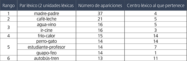 En la tabla que hemos elaborado, destacan dos centros de interés: 5. Alimentación, con dos pares léxicos situados en una segunda (café-leche) y una tercera posición (agua-vino); y 14. Naturaleza, con el par léxico frío-calor en una cuarta posición y el par perro-gato en la quinta.