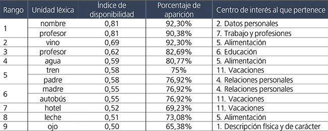 Así, nombre, profesor y vino son las palabras más disponibles en el lexicón de los alumnos cuando se evocan en sus correspondientes centros de interés. Veamos con un ejemplo cómo leer cada una de las líneas de la tabla. Cuando a los informantes se les presenta el tema 2. Datos personales, lo primero que al 92,30% de ellos le viene a la cabeza es la palabra nombre. Estos vocablos, además de presentar un elevado porcentaje de aparición en las encuestas, suelen aparecer en las primeras posiciones de la lista en su centro de interés correspondiente, de ahí su elevado IDL.
