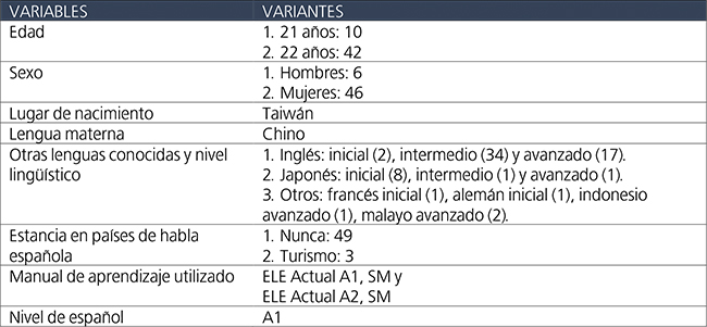 En la mayoría de los estudios suelen tenerse en cuenta algunas variables que también hemos incluido en la recogida de datos, tal y como explicamos en el apartado 5.1. La muestra. De todas estas variables, solamente dos pueden ser objeto de comparación en nuestro estudio: el sexo (6 hombres y 46 mujeres) y la estancia en países de habla española (49 nunca han estado en España y 3 han estado de turismo). El resto de variables se convierten en variables control, ya que todos los sujetos de la muestra comparten las mismas características en cuanto a manual de aprendizaje utilizado (ELE Actual A1 y A2, de SM), nivel de español (A1), edad (entre 21 y 22 años), lugar de nacimiento (Taiwán) y lengua materna (chino). En la recogida de datos también incluimos el conocimiento de otras lenguas y su nivel lingüístico, pero entendemos que nuestro estudio se complicaría y la atención se apartaría de nuestro propósito inicial.
