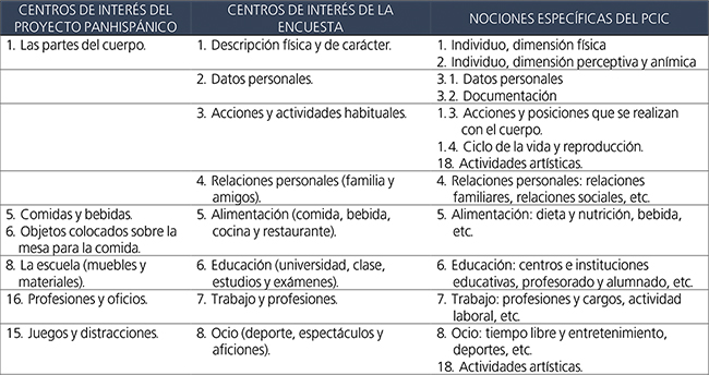 Adelantábamos en la introducción que esta investigación sigue el mismo criterio metodológico que el Proyecto Panhispánico, tal y como han venido haciendo casi todos los trabajos que en nuestra lengua se han publicado a lo largo de estos últimos años y que en su mayor parte hemos reseñado en los apartados anteriores. De todos modos, cuestiones como la nominalización de los centros de interés han sido ligeramente adaptadas a las condiciones específicas de nuestra investigación. En los subapartados que aparecen a continuación daremos una explicación más detallada al respecto.